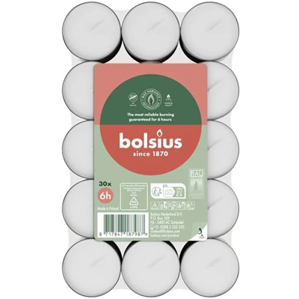 Bolsius doba hoření až 6 h 30 kusů čajových svíček bez vůně