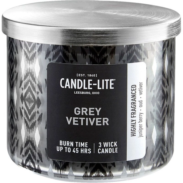 Grande bougie parfumée en verre avec imprimé 3 mèches Grey Vetiver Candle-lite 396 g