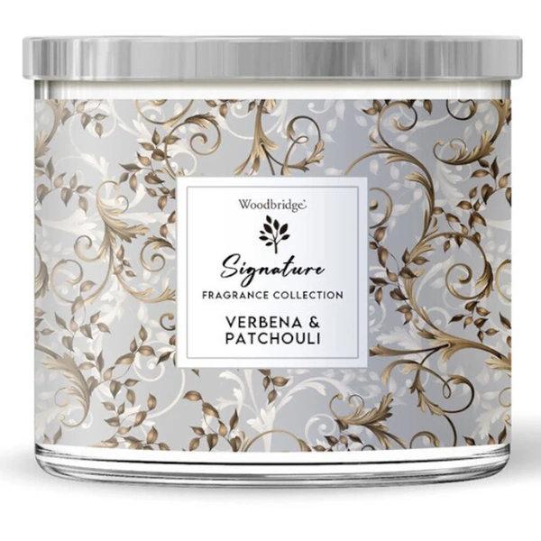 Grande bougie parfumée en verre à trois mèches Verveine Patchouli Woodbridge Candle 410 g