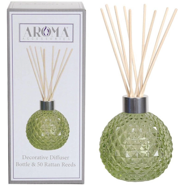 Bouteille vide verte avec bâtons diffuseurs dans une boîte à Woodbridge Candle