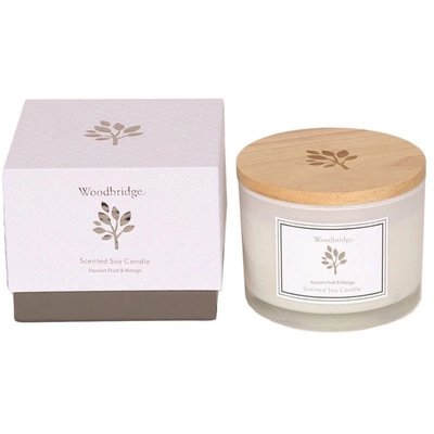 Grande bougie parfumée au soja dans un verre de lait en cadeau emballée dans une boîte Fruit de la Passion Mangue Woodbridge 370 g