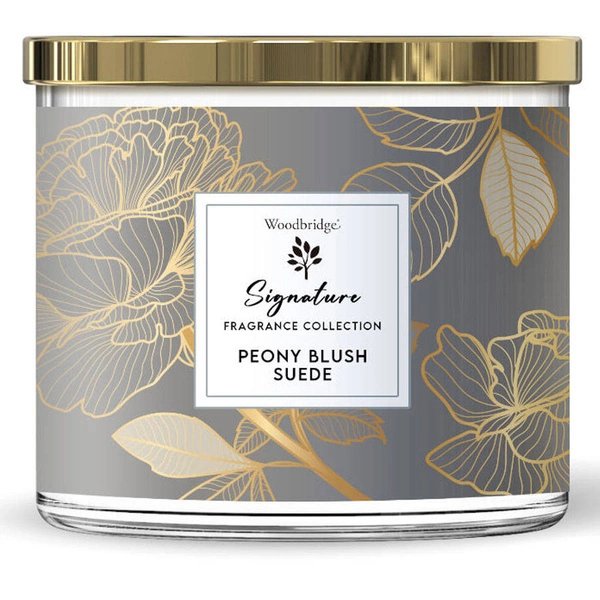 Grande bougie parfumée florale en verre à trois mèches Peony Blush Suede Woodbridge Candle 410 g