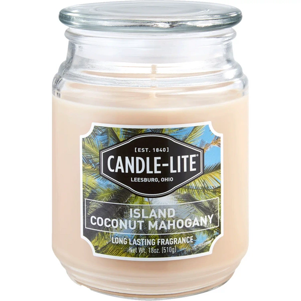 Candela grande profumata al cocco in vetro Island Coconut Mahogany Candle-lite 510 g