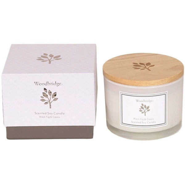Candela grande profumata alla soia in vetro di latte in regalo confezionata in una scatola Candela Black Fig Cassis Woodbridge 370 g