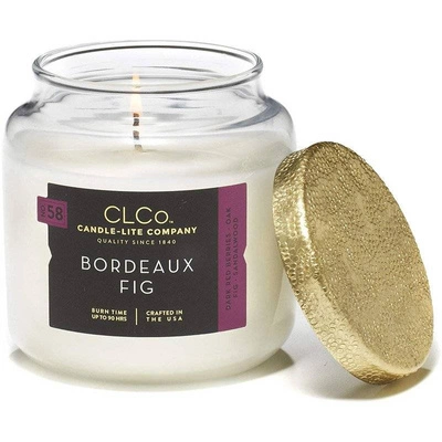 Candela grande profumata alla frutta in vetro con coperchio dorato Bordeaux Fico Candle-lite 396 g