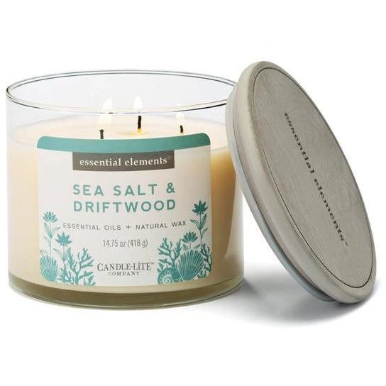 Candela grande profumata alla soia con oli essenziali in vetro 3 stoppini Sea Salt Driftwood Candle-lite 418 g