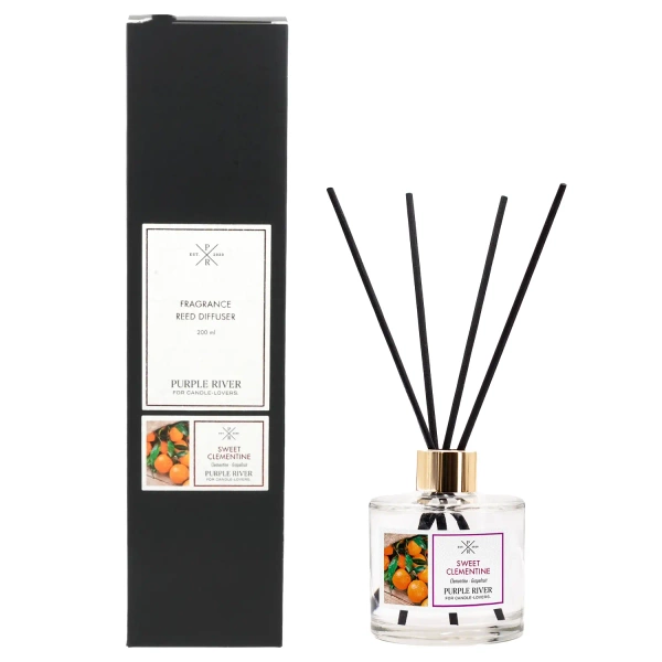 Patyczki zapachowe w szklanym flakonie zapakowane w pudełko cytrusy Sweet Clementine Purple River 200 ml