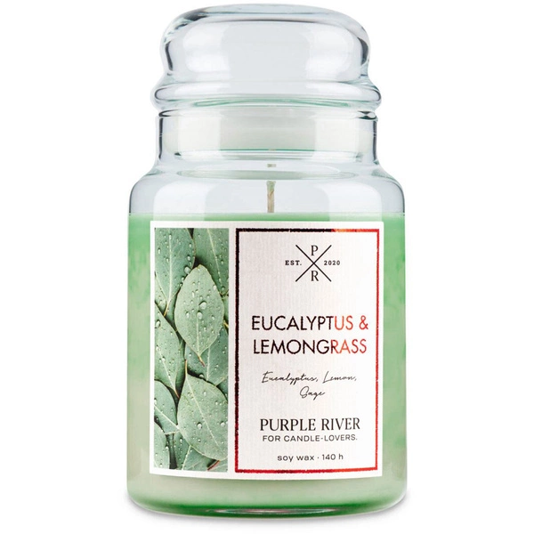 Duża sojowa świeca zapachowa w szkle ziołowa eukaliptusowa Eucalyptus Lemongrass Purple River 623 g