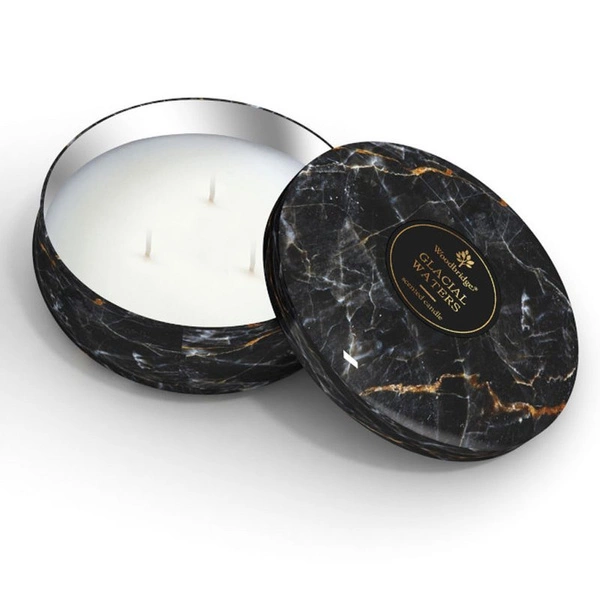 Duża marmurowa świeca zapachowa w metalowym puzderku z trzema knotami Glacial Waters Woodbridge Candle 470 g