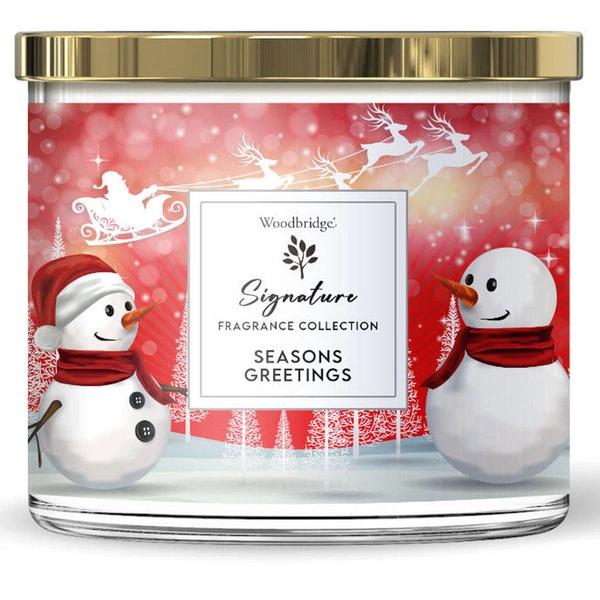 Duża świąteczna świeca zapachowa w szkle z trzema knotami Seasons Greetings Woodbridge Candle 410 g