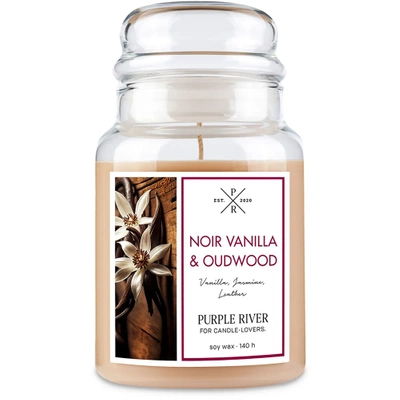 Veľká sójová sviečka v sklenenej nádobe s vôňou orientálnej vanilky Noir Vanilla Oudwood Purple River 623 g